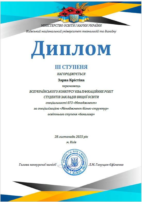 Для участі у конкурсі була подана кваліфікаційна робота випускниці 2025 року, бакалавра менеджменту Крістіни ЗАРВИ – переможниці першого етапу, проведеного на факультеті економіки та соціальних комунікацій Дніпровського державного технічного університету.